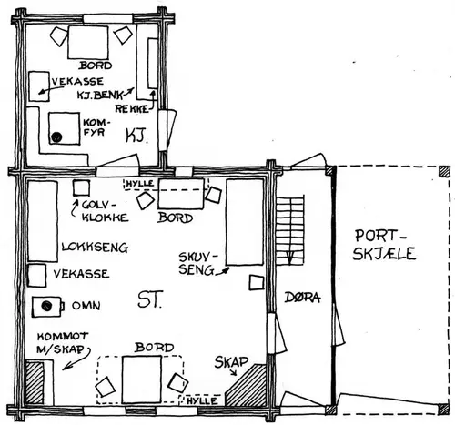 • Rasmusgården, ettromsplan med døra på røstveggen av stua og med tilbygd portrom og kjøkkenutbygg. Møbleringa er tegnet etter opplysninger fra Olaf R. Vintervold (1975). Sverre A. Ødegaard