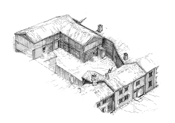 A typical farm in the mining town with living quarters in the front, and barn, stable and outhouse behind the farmhouse. Illustration: Sverre Ødegaard